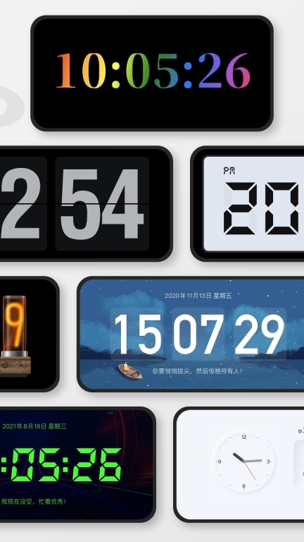 2、【风格百变的时钟皮肤】换上心仪的皮肤,是不是会更想打开App,立刻开启今日的任务呢?科技、星空、自然、艺术、复古、四季、暗黑、清新等各类风格与分类的数字时钟和模拟时钟皮肤,正等你挑选。