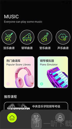 1.选用黑色与荧光绿作为主色调,用户在查找课程和曲谱时,能够拥有十分前卫的界面使用感受。