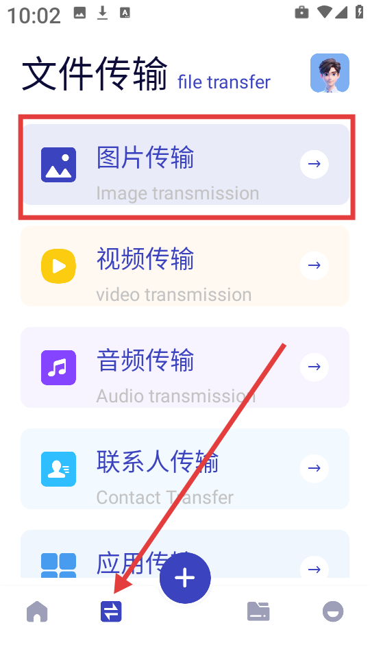 2、接着点击下方箭头所指的图标,找到“图片传输”。