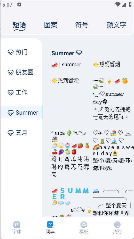 5、“词典”页面包含朋友圈文案、工作相关文案以及夏天文案等内容。