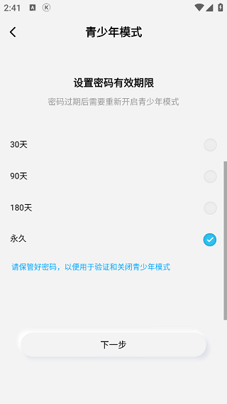 5、随后需要根据自己的需求选择一个合适的密码有效期。
