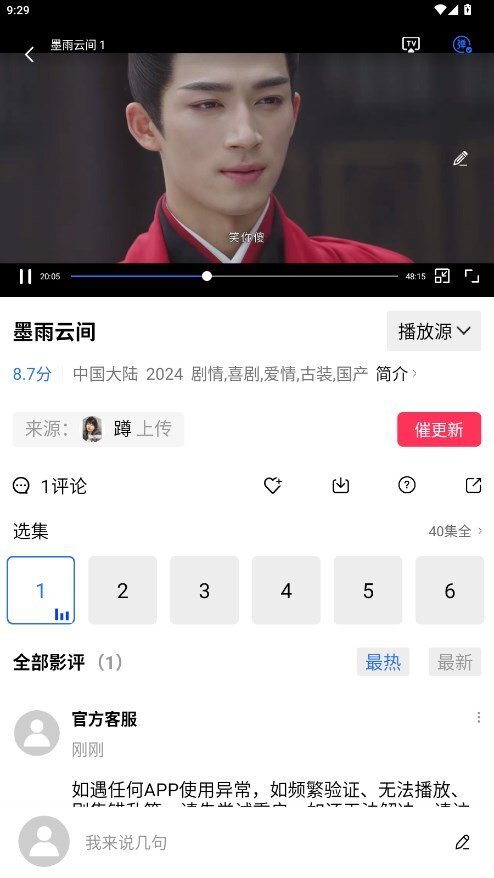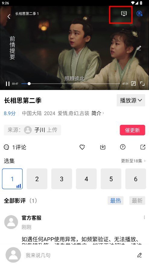 2、选择喜欢的影视剧进行播放,在播放页面,可以直接看到投屏以及功能。