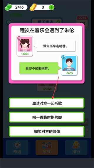 1、在游戏里遇到新角色时会触发对话,比如程岚在音乐会碰到朱伦,可点击邀请对方一同听歌以加深彼此关系。