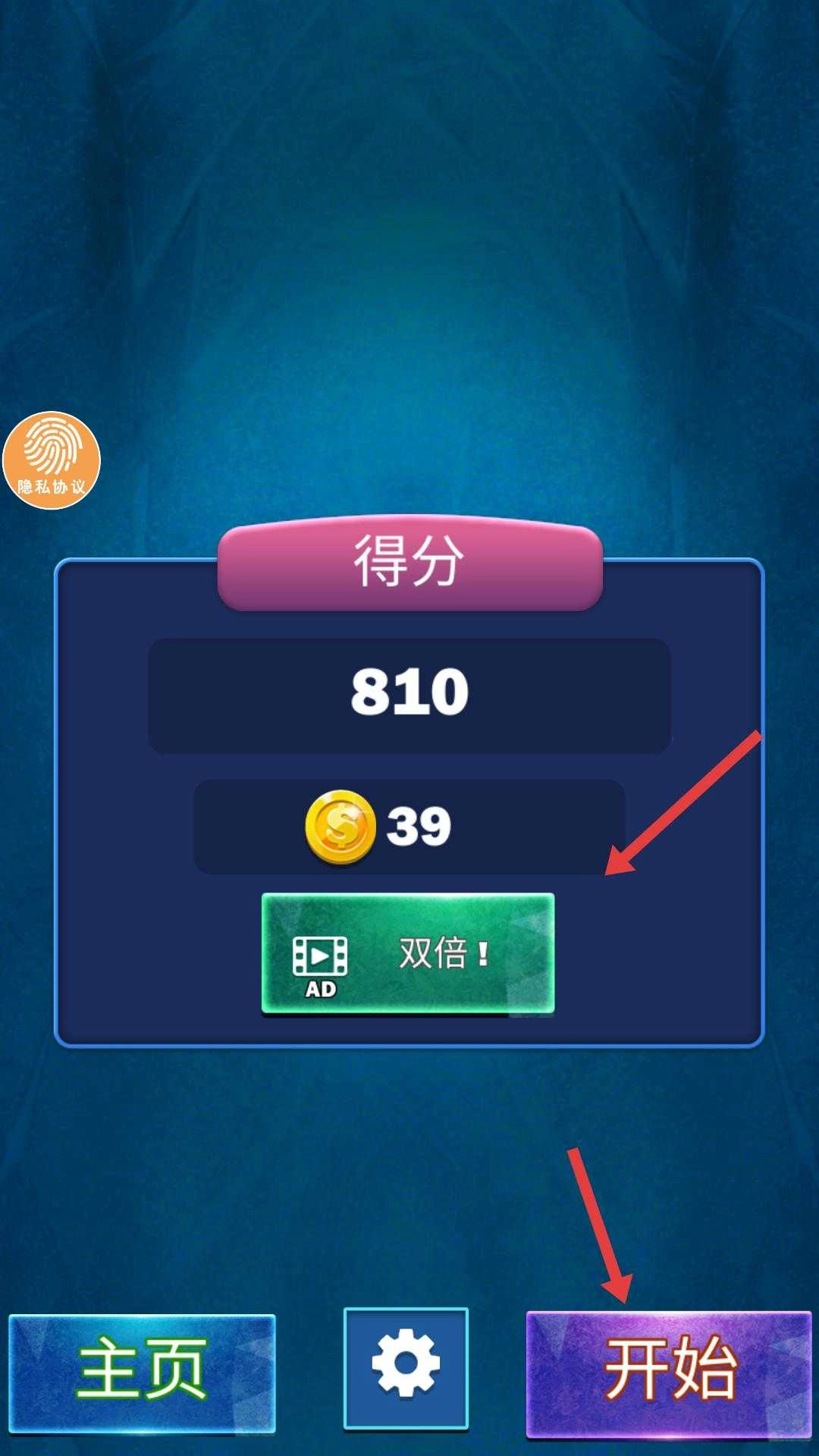 4、游戏结束后,会显示得分和收集的金币数量,此时可选择观看广告双倍获取奖励,或直接点击开始,进入下一次游戏挑战。