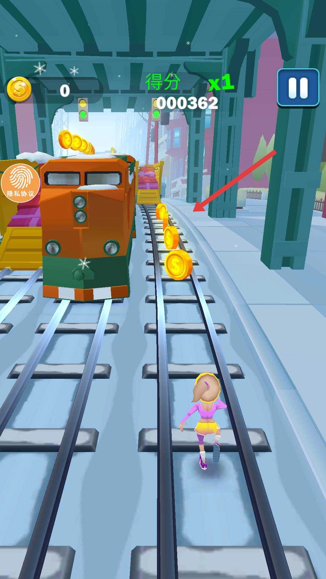 1、进入游戏后,操控角色在轨道上奔跑,通过滑动屏幕来躲避火车、箱子等障碍物,保持持续前进。