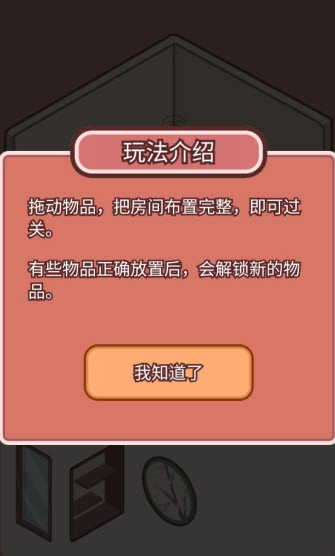 2、拖动物品,把房间布置完整,即可过关。有些物品正确放置后,会解锁新的物品。