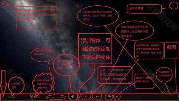添加物体,点击add按钮,就会出现以下界面:在这里可以添加行星,恒星,卫星,星系,黑洞,日常物体,航天器等。你可以点击你想要添加的物体,然后把它放在这个空间中,理论上,这个空间中可以放置的物体数量是无限的。
