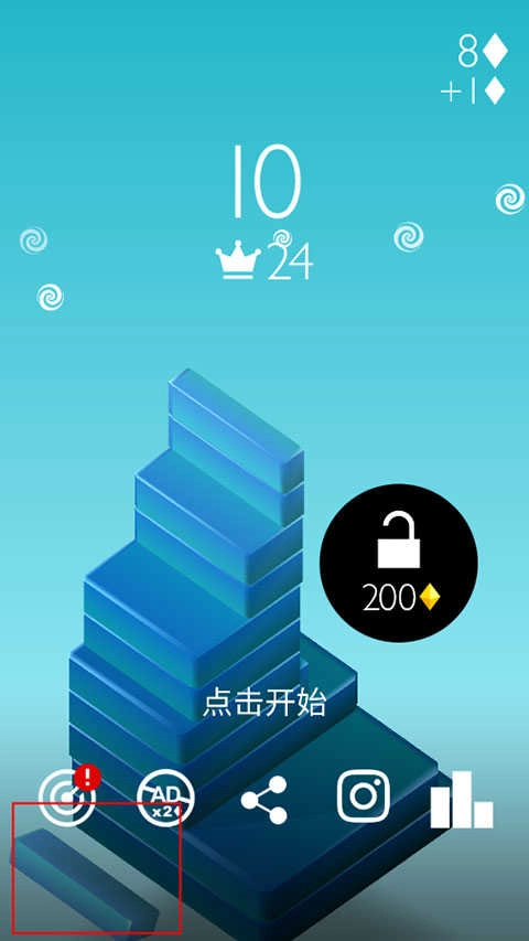 1、游戏开始后,有一块滑块滑动过来,点击屏幕,就会定格下落,尽量要与下面一个滑块重合;