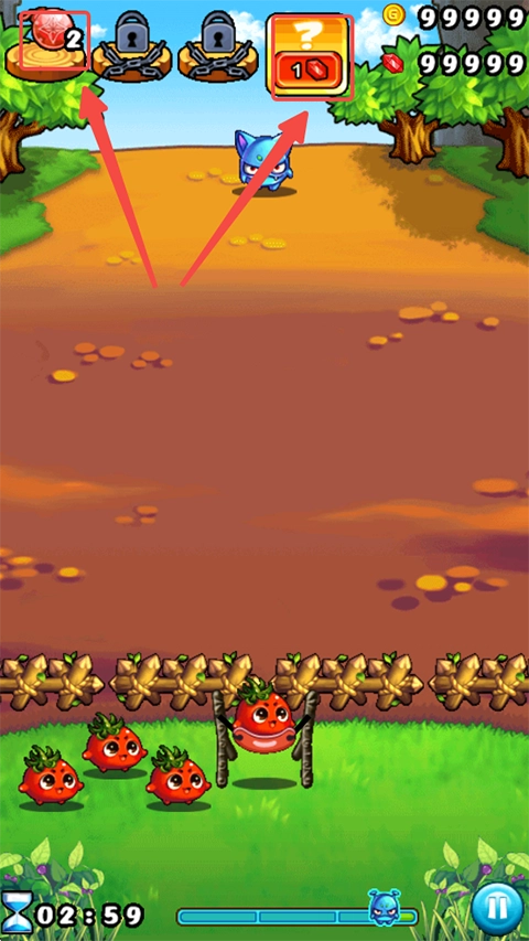 5、每种蔬菜都有特殊技能,玩家往下持续拉弹弓可以看到植物冒火,松手后植物就会触发技能。