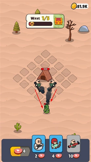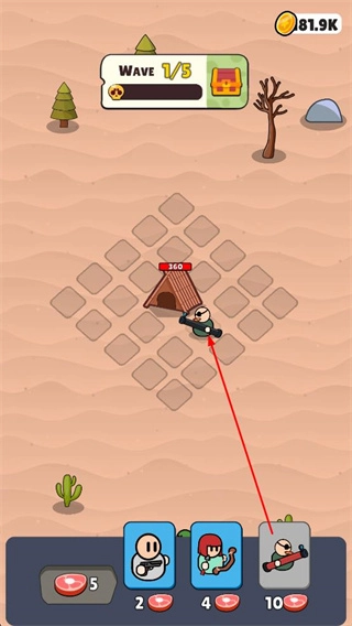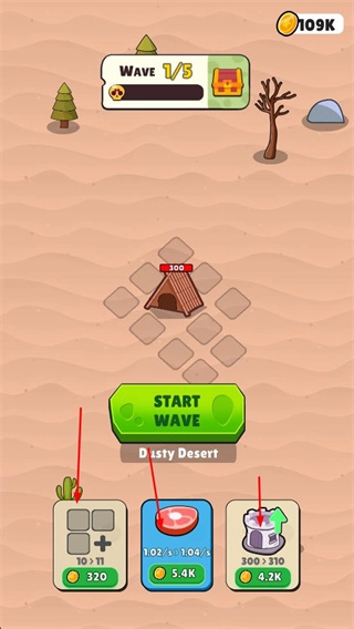1、在沙漠场景里,点击START WAVE即可开启波次挑战,与此同时还能花费金币来升级资源产出与营地设施,以此强化防御根基。