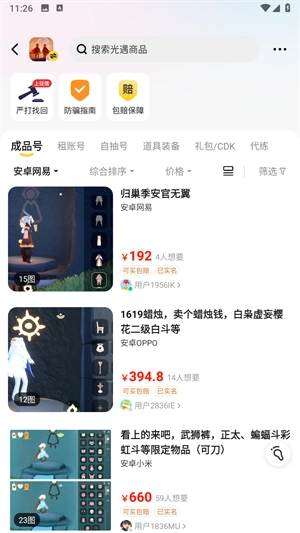 以《光遇》为例,点击进入该游戏专区后,这里提供了大量的账号资源可供挑选,你可以根据自己的需求进行筛选操作。