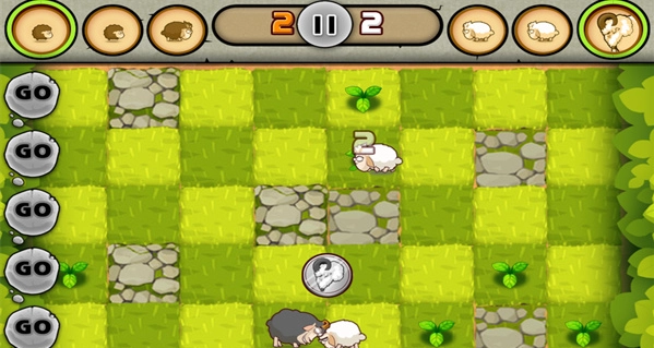 这个模式的玩法很容易也富有技巧性,开始准备前双方整容将分别位于左右两侧,决斗场中央共五条进攻线路,点击任意一条线路上的“GO”则向该路派遣一只屏幕上方的准备出战的羊。当然敌人也可以在相应线路派出羊只堵截,这个时候技巧和策略性就来了。当我们出击中的碰碰羊冲到对方的底线则赢得分数,在限定时间内获得分数高的一方获胜,因此在策略模式中技巧策略的选择和运气同样重要。