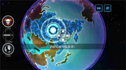 首先,你会有几秒钟的时间来观察地球上其余的核势力(如果有侦查科技的话可以无视),然后会进入一片迷雾,只会看见你的领土和其周边地区。解释一下游戏中图标,首先你得点击一块自己的领土。