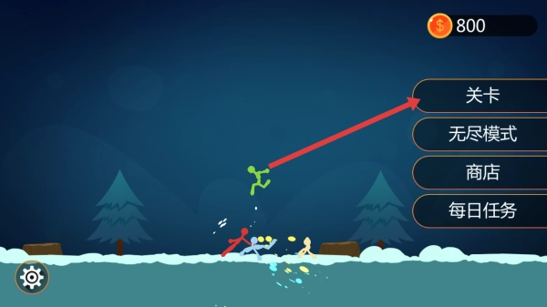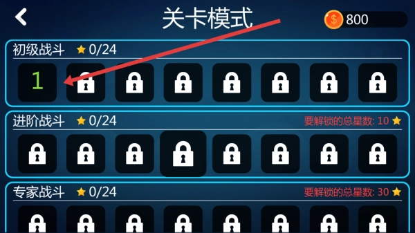2、在关卡模式界面,按照箭头指示选择初级战斗下的1号关卡,进入该关卡开始火柴人战斗任务。