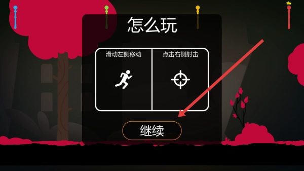 3、在玩法说明界面中,观察完后了解滑动左侧移动、点击右侧射击玩法后进入战斗,点击继续按钮。