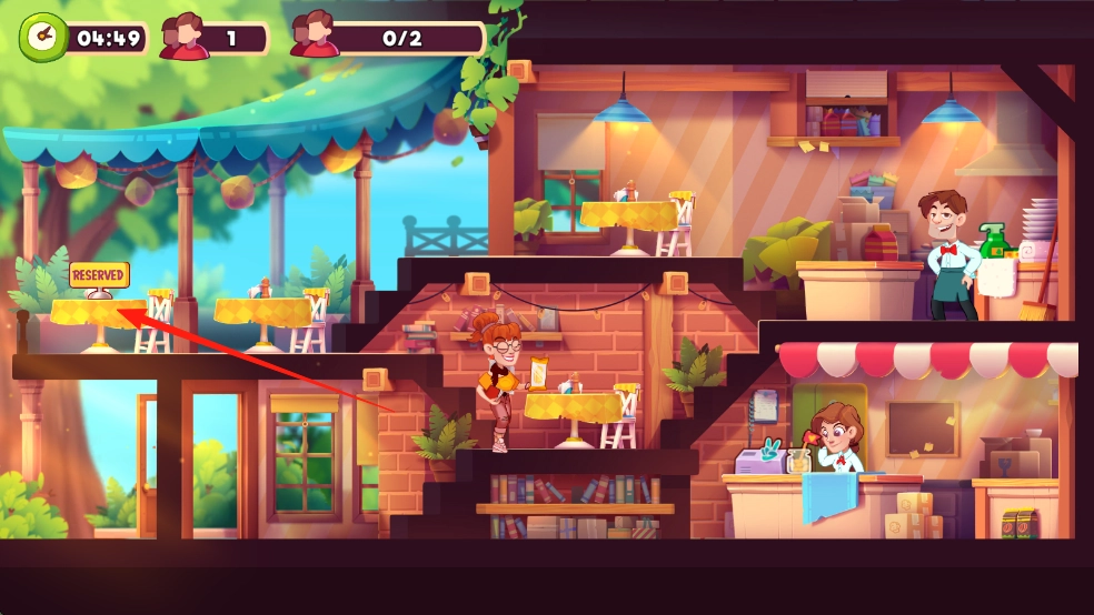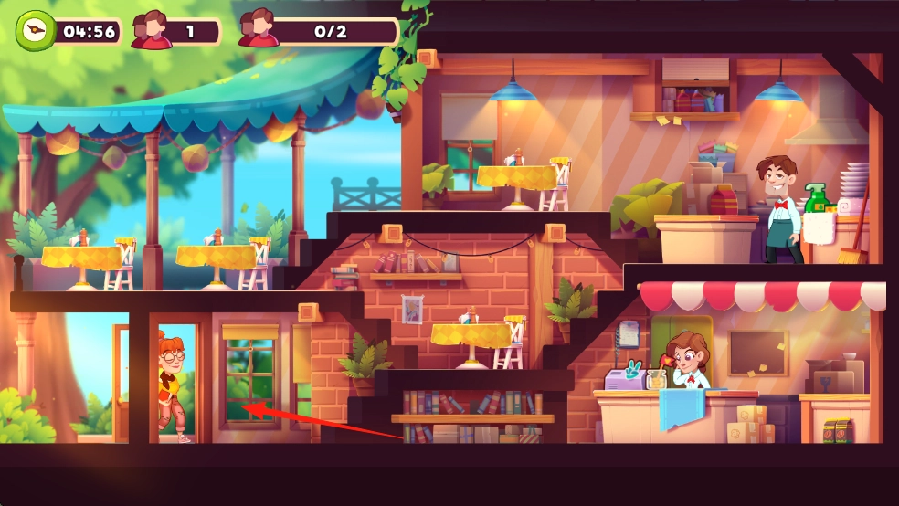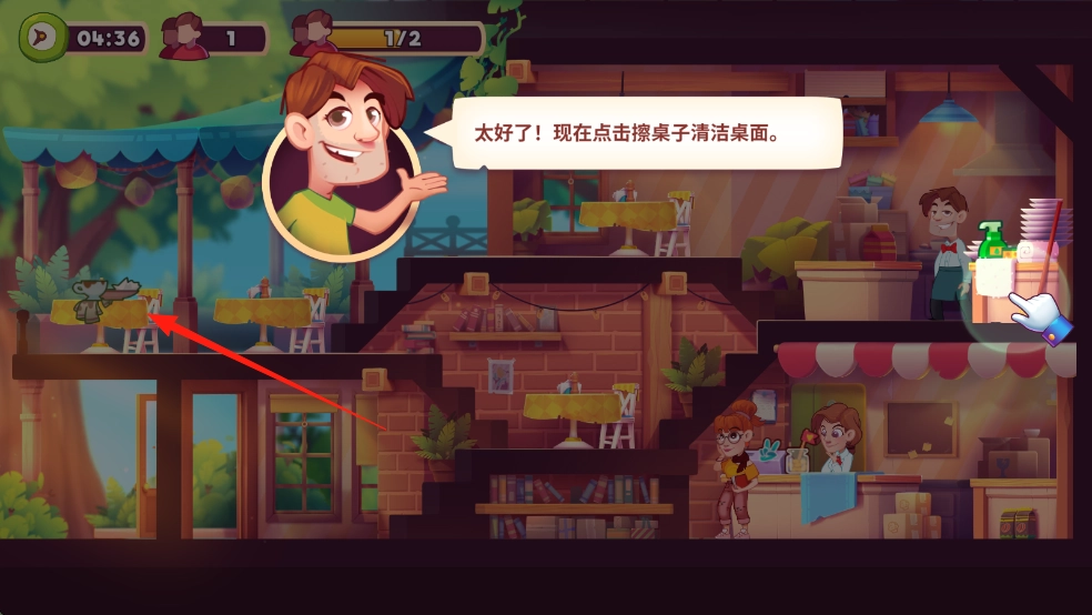 3、顾客离座后,按提示点击箭头处桌子,用抹布清洁,完成桌面清理。