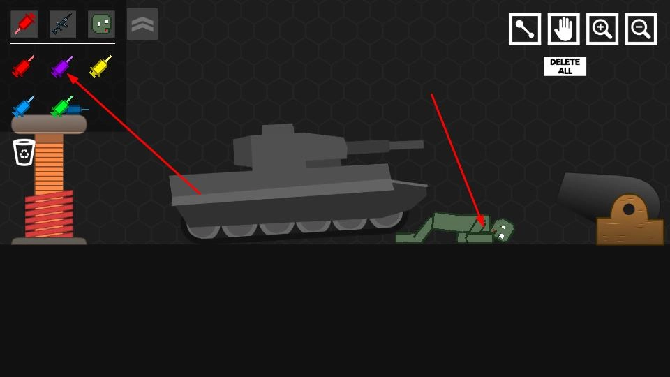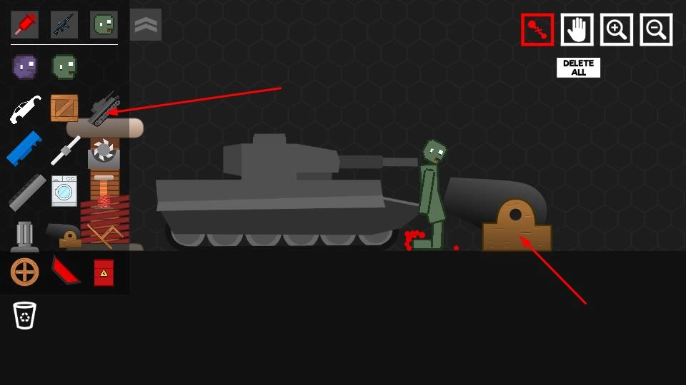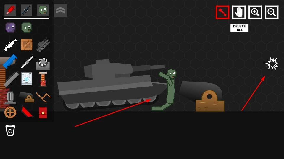 1、点击左侧道具栏里的坦克、武器等图标,将其拖放到场景的空白区域,玩家需搭建初始互动布局,以此开启沙盒创作。