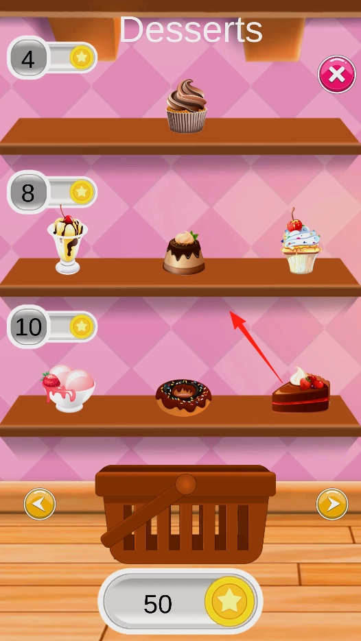 2、进入甜品商店,货架上摆满蛋糕冰淇淋,用50金币,选喜欢的甜品,点对应货架上的美食,放进购物篮,给小猫买好吃的,让它吃得开心,还能解锁新甜品。