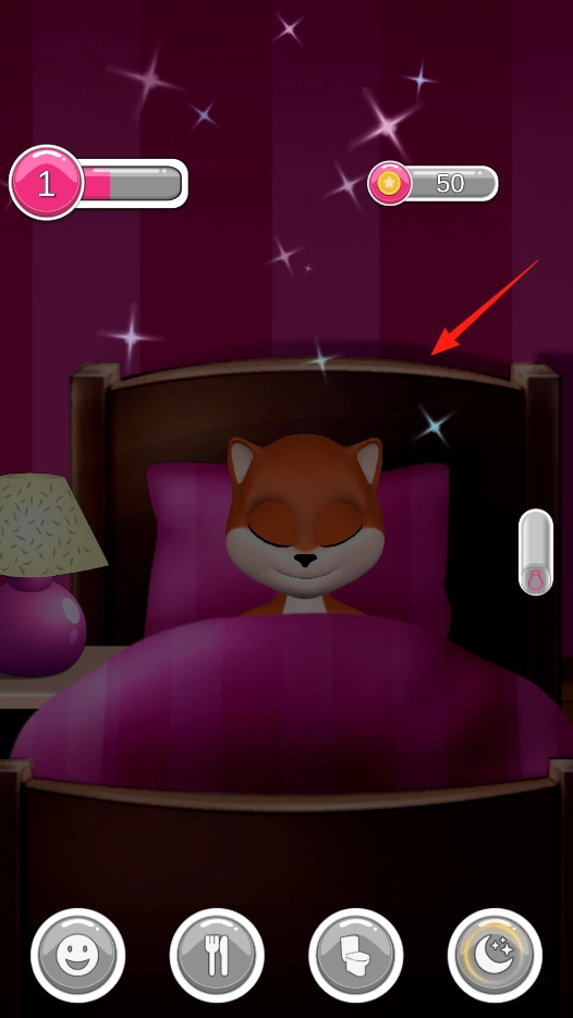 3、到睡觉时间,点月亮样式的按钮,小猫会躺到床上睡觉,看着它甜甜的睡相,等它休息好,精力恢复,就能继续陪它玩耍照顾它,让小猫健康成长。