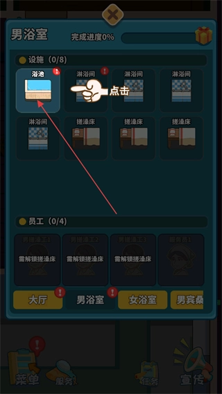2、在菜单中选择男浴室相关内容,点击浴池准备进行设施设置。