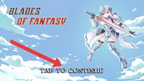 1、点击“TAP TO CONTINUE”进入游戏流程,画面中展示着一位持剑角色,这是日式奇幻风格的动作或角色扮演类游戏的开局引导页面。