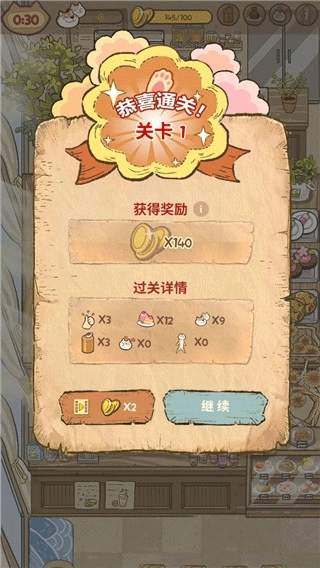 5、喵之料理大师游戏中每挑战成功一关,都可以获取相应的关卡资源奖励
