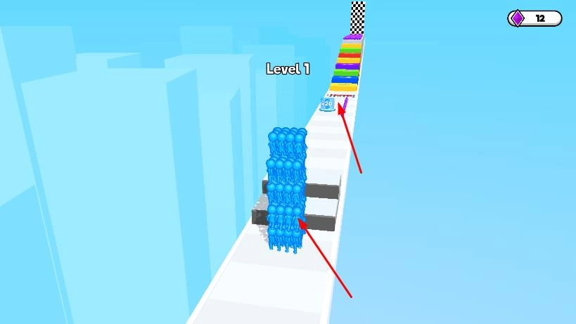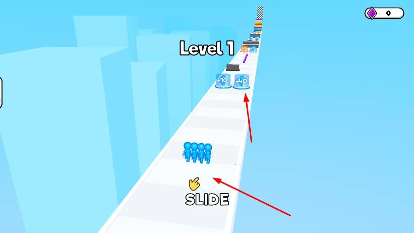 1、进入Level1关卡后,通过滑动屏幕来操控蓝色人群进行左右移动,收集道路上的增益道具,比如+10、+44这类道具。