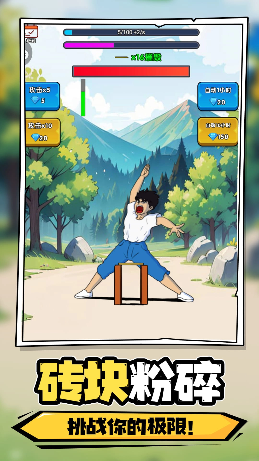 3、砖块摧毁为核心目标,设有不同倍数攻击选项与自动模式,玩家借助操作角色来达成更高摧毁成就。