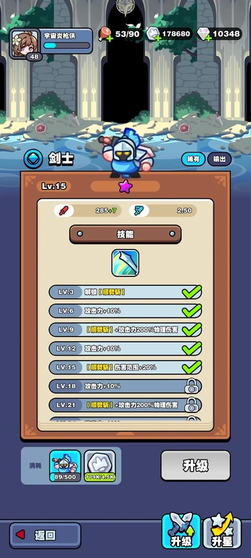 了解清楚单人关的主要构成,下面就是重点了,首先我们把送的银箱子开起来,然后开木箱子,把坐牢的角色放出来,去开金箱子,幸运币用来配合牢角色组合神话,或者去赌金色角色,单人关小怪只能使用金色角色和神话角色来过渡,所以箱子里的幸运币用来开金色角色,金色角色出来以后,前期能稳住发育,把剩下的幸运币用来强化等级