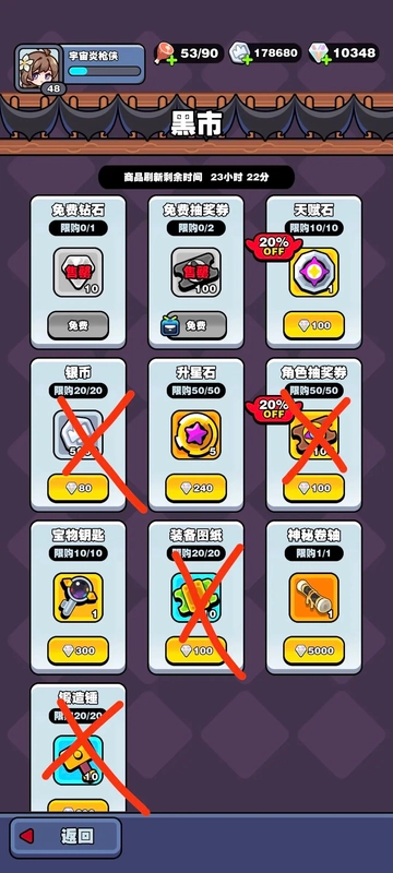 黑市可以买天赋石,前期可以买钥匙开紫色宝物过渡,招募券和锤子不推荐用砖石购买,天赋石很重要,能多攒就多攒,砖石要保留2k左右,预防神话招募砖石不够