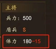 体力:体力决定了我们能够行动的次数,也相当于我们能够进攻土地的次数。部队每次执行攻占、行军、采集等指令时,需要消耗8点体力(新手期过后是消耗15点体力)。体力随时间恢复,每半小时恢复15点体力值,武将体力上限为180点。