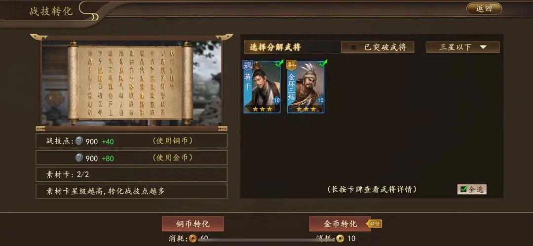 5. 战技点介绍:除了武将,还有战技点也是一个需要获得持续资源的,对于开荒有很大的作用,提升战技的效果就是给战技升级。战技点的获取方式可以通过铜币招募武将,招募到的低星武将可以转化为战技点。