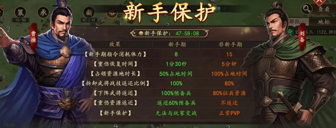 在这48小时里,体力消耗减半、重伤时间减半、占领土地时间也大幅度缩短,对我们前期开荒都是很有效率的,等同于新手期2天时间开荒是非新手期4天开荒时间,势力值排名关键就在于这2天的新手期,一定要把握住。