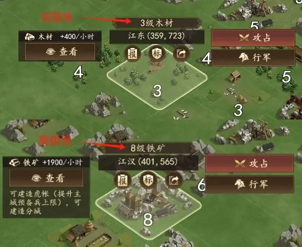 5. 开荒期最核心的事情,就是通过打低级土地,让武将升级,再打更高的土地,获得更多的资源来升级建筑。