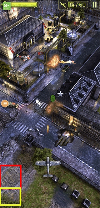 3、进入具体游戏界面后,我们就可以开始玩了,左右滑动你的飞机红色方框内的按钮是丢炸弹,黄色方框内的按钮是加大子弹密度。