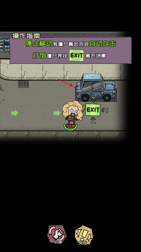 3、当你通过滑动屏幕来移动角色,会遇到僵尸,只要靠近僵尸就会自动攻击,将所有的僵尸都打败后找到“EXIT”离开当前场景。