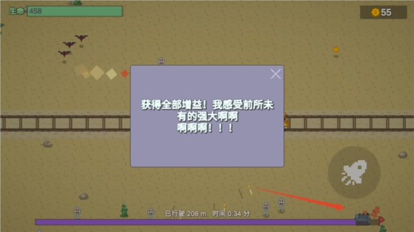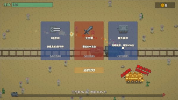 3、每运行一定的距离,或者消灭一些敌人,就会获得技能升级选项,点全部获取就是看广告,不看广告就是三选一。