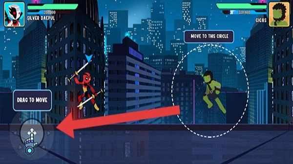 3、战斗时,拖动左侧摇杆(DRAG-TO-MOVE),控制角色(如Silver-Darpul)移动,按提示“MOVE-TO-THIS-CIRCLE”,接近敌人,释放技能攻击。