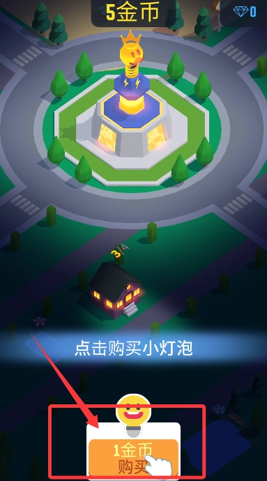 1、打开游戏,点击用金币购买,得到小灯泡来为这座城市点亮基础光源。