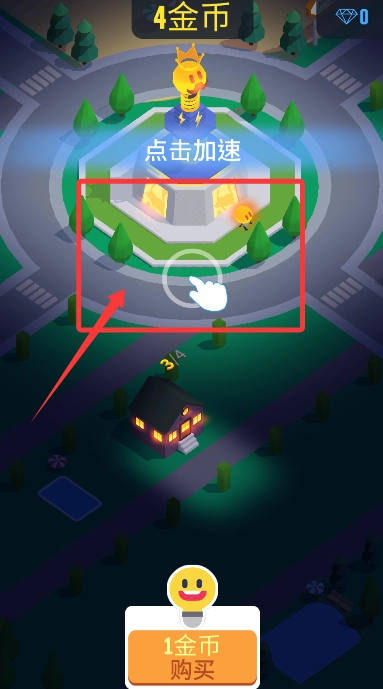 2、按指示点击建筑周边加速区域,消耗金币提升灯泡生产或移动速度,推进建设。