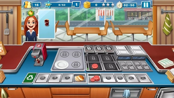 进入营业后,你的客人会源源不断的前来消费,此时你需要根据顾客的点餐需要来制作对应的食物,而这里的制作方式是分开进行的,也就是说,配料的搭配显得尤为重要,每一样顺序就更加重要了,若搭配失败怎么办?只能将制作好的食物丢掉了,而这将影响顾客的耐心,并有损时间,限定时间内完不成目标,将得不到三星评价,也就意味着玩家要升级的速率变低。