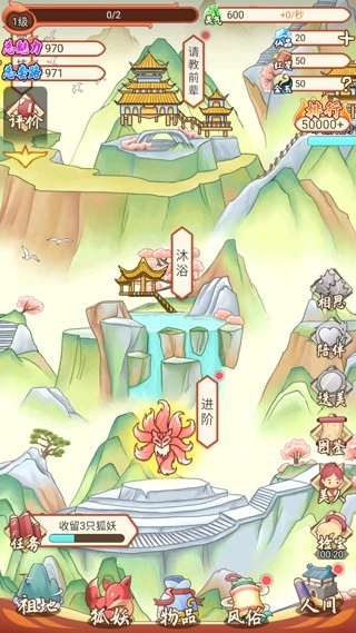 游玩设施:优先升级闺房、神石等,提升狐妖挂机收益。