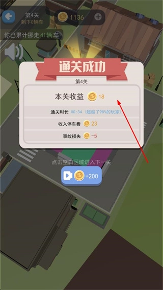 4、通关后,点击进入下一关,挑战更复杂的停车场景,朝着积累更多车辆移走数和金币的目标努力。