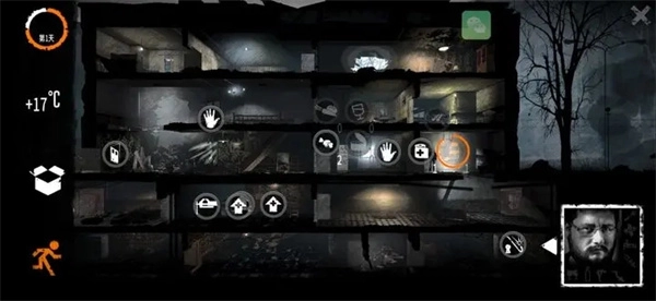 黑夜大部分地区的战争都会停息(有些地方有几率陷入交战状态,无法进入,大概8—10天),玩家可以趁这段时间操纵角色去其他区域的废墟搜寻物资,不同的地方,物资种类的多少也不同,有些区域会存在幸存者,如果玩家露出武器或者进入禁区会遭到幸存者的警告以及攻击,偷窃幸存者私有的物资也会遭到警告以及攻击(只要没被发现,比如关着门在里面偷),也有些幸存者愿意同玩家交易。也有可能遇见土匪,土匪一旦看见玩家所操纵的角色就会进行攻击,几乎所有土匪都持有枪支,玩家前期很难正面杀死土匪。(地图如果介绍谨慎,那就是有无辜民众或不带枪的士兵,危险一般指带枪和武器的军人)