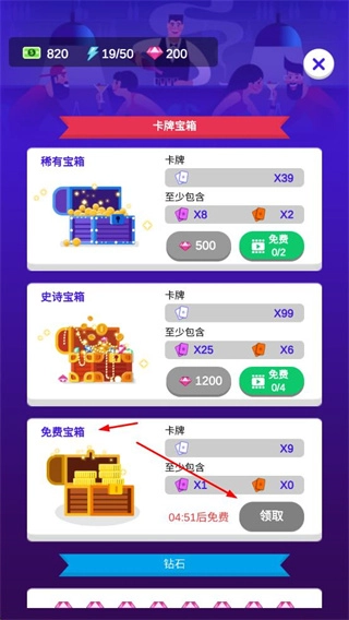 2、参与卡牌宝箱活动,领取免费宝箱或消耗钻石购买稀有、史诗宝箱,获取卡牌等资源,加速公司发展。