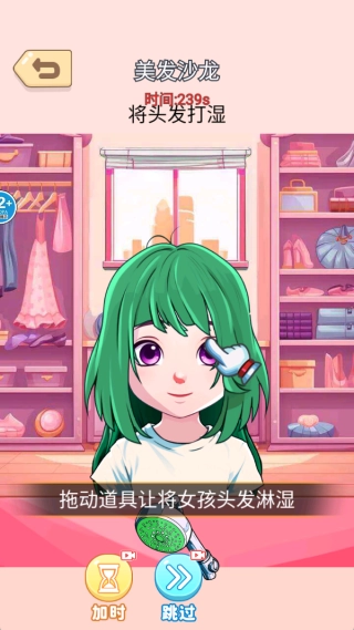 3、洗脸环节采用模拟真实的交互方式,成功完成洗脸后,公主会露出舒适表情,同时解锁后续化妆工具。