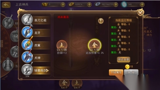 当主公等级达到30级时,神兵五行开启,每个神兵都有自己独特的五行属性,主公可以通过消耗五行宝珠进行升级,进一步增加神兵属性,提升自身实力。