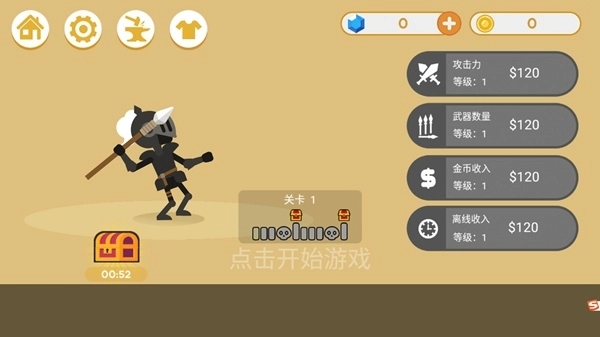 7、通过关卡后我们能够获取金币,这些金币可用于提升攻击力、武器数量、金币收益以及离线收益的等级,从而得到更强大的加成效果。