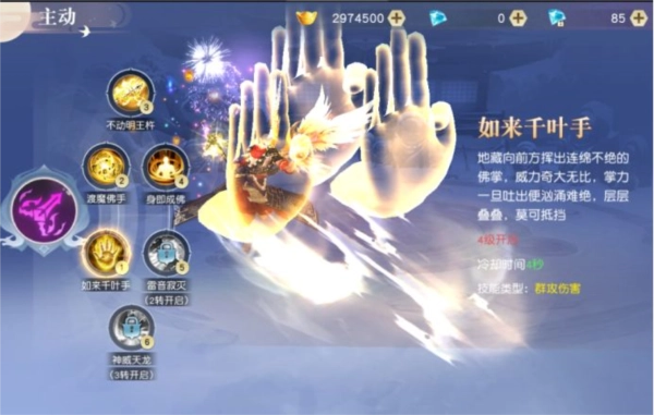 技能效果:地藏向前方挥出连绵不绝的佛掌,威力奇大无比,掌力一旦吐出便汹涌难绝,层层叠叠,莫可抵挡