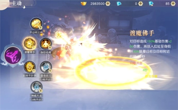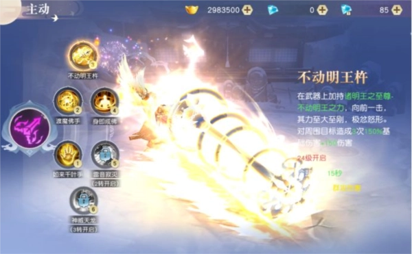技能效果:在武器上加持诸明王之至尊-不动明王之力对目标周围造成3次150%基础伤害+150伤害。